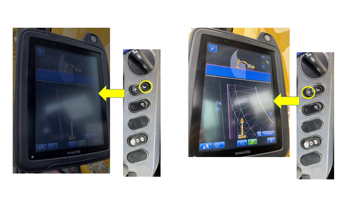 Obrazovka monitoru rýpadla Komatsu iMC je tmavá, takže nejsou vidět písmena a číslice.