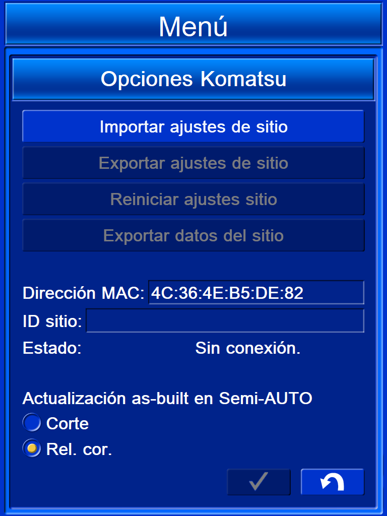 Vaya a "Opciones Komatsu" en el "Menú" y seleccione "Rel. cor." para la actualización semiautomática de la pieza.
