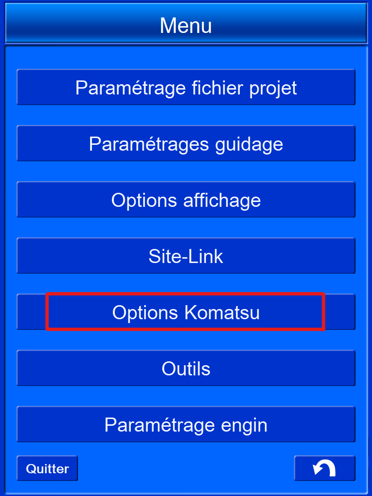 1) Appuyez sur "Oprions Komatsu" dans le menu.