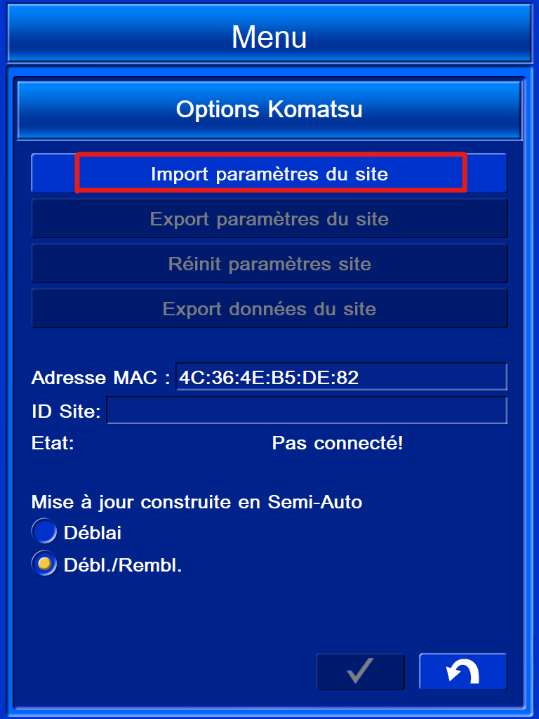 Pour afficher l'historique de construction, vous devez importer et configurer le fichier SL3 correspondant au chantier du tableau de bord Smart Construction sur le moniteur Komatsu iMC.