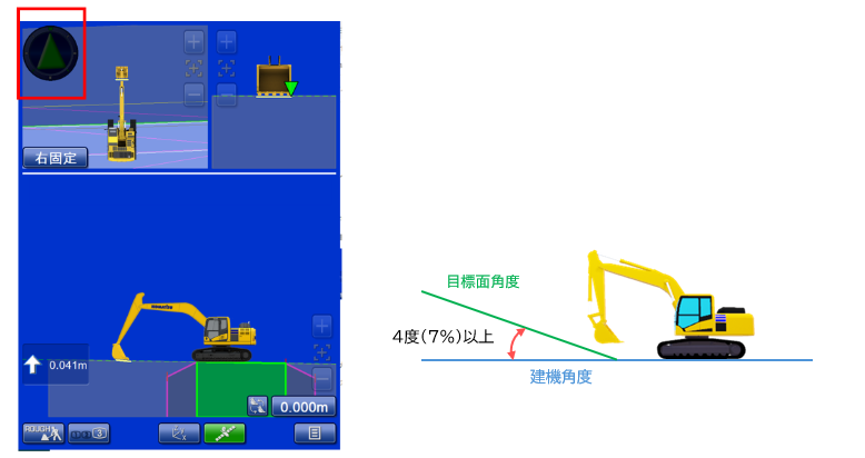 施工面と建機のいる面が同一面上にあり、角度差がない可能性があります